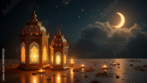 Fototapeta premium Ramadan Lantern Night Scene. Concept of Islamic celebration, peace, and spirituality.