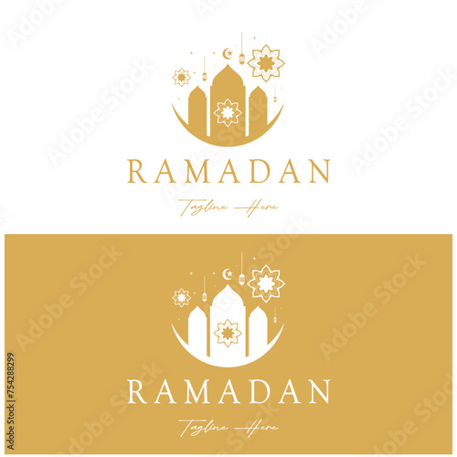 © Tomi43, Fototapeta premium Ramadan Mubarak logo with lantern elements, crescent moon and star mosque building, Islamic calligraphy pattern, for business, architecture, Muslims, Eid, Eid cards, Islamic education