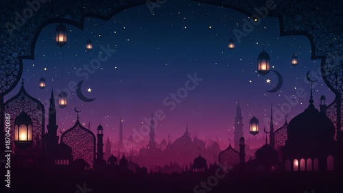 Fototapeta premium Ramadan Night & Eid El Fitr Celebration Islamic Cityscape Lanterns Crescent...