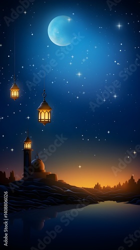 Naklejka premium Ramadan Night Sky with Moon Mosque and Lanterns