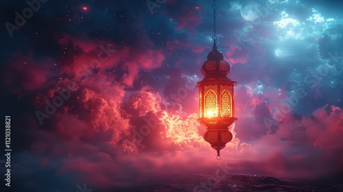 © Shahadat Graphics, Obraz premium Ramadan Nightscape Illuminated Lantern, Celestial Clouds, Moonlit Sky