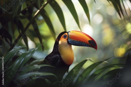 © nsit0108, Fototapeta premium Ramphastos sulfuratus enjoying the sunlight filtering through jungle leaves