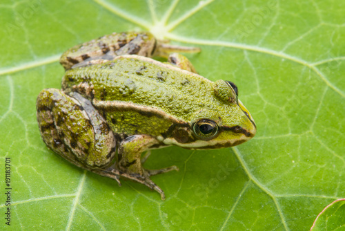 Fototapeta premium rana esculenta - żaba zielona na zroszonym liściu