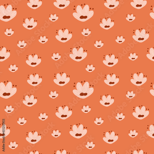 © smth.design, Fototapeta premium Random little pink doodle flowers silhouettes seamless pattern. Orange background. Decorative print.