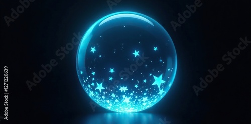 © Machita, Obraz premium Random Size White Stars Inside a Glow Aqua Blue Circle Bubble on Black Background, illuminated, glow aqua blue, luminous