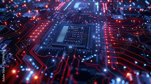 © Piyapan, Fototapeta premium Randomized hi-tech backdrop with pulsating LED lights and intricate microchip designs creating a dynamic, digital aesthetic