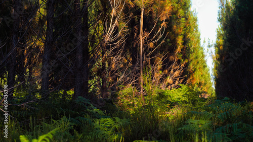 © Anthony, Fototapeta premium Rangées de pins et vue rapprochée de fougères vertes, dans la forêt des Landes de Gascogne