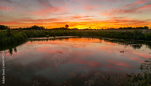 © Яна Бондаренко, Obraz premium Оrange sunset over a video game style pond