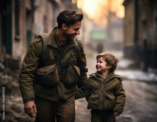 Fototapeta premium Rangers and children on battlefield background.