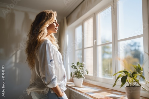 Fototapeta premium ranquil Moments: Woman's Relaxation by the Windows of Her New Home