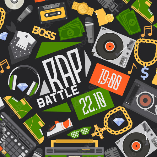 © Vectorvstocker, Obraz premium Rap music vector seamless pattern dj playing disco on turntable sound record illustration backdrop of rap cap discjockey headphones money player playback in nightclub background