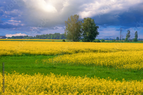 Obraz premium Rape flowers against a blue sky with clouds in rays of sunlight on nature in...