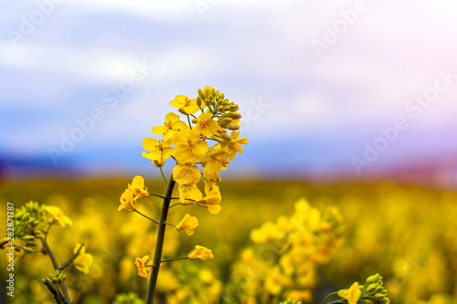 Fototapeta premium Rape seed flowers at a blue sky with white clouds.