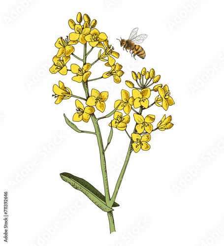 Obraz premium Rapeseed blooming branch with flying bee