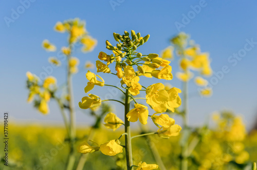 © Igor, Fototapeta premium Rapeseed (Brassica napus), also known as rape, oilseed rape. Blooming rapeseed and blue sky in the background.