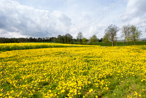 Fototapeta premium Rapeseed field yellow flowers and blue sky