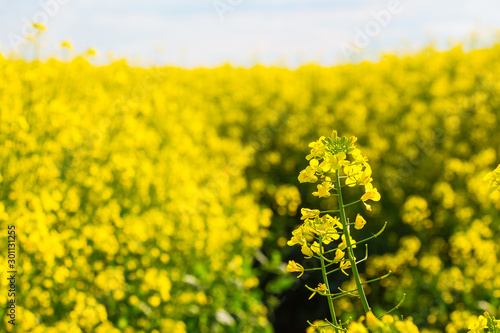 Obraz premium Rapeseed flowering. Farm field with yellow flowers rapeseed _
