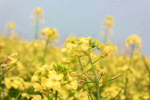 © he, Obraz premium Rapeseed flowers growing in the sun and bees collecting nectar