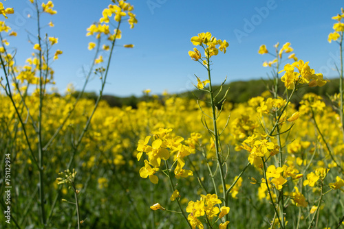© Sarolta Nagy, Fototapeta premium Rapeseed yellow flower close up in front of the rapeseed field.