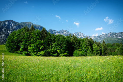 © gaborphotos, Fototapeta premium Rapsfeld at the Alps in spring time, Austria