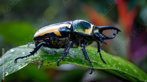© alfi, Naklejka premium Rare animal Goliath beetle (Goliathus goliatus) resting majestically on a vibrant green leaf in the depths of a tropical rainforest.