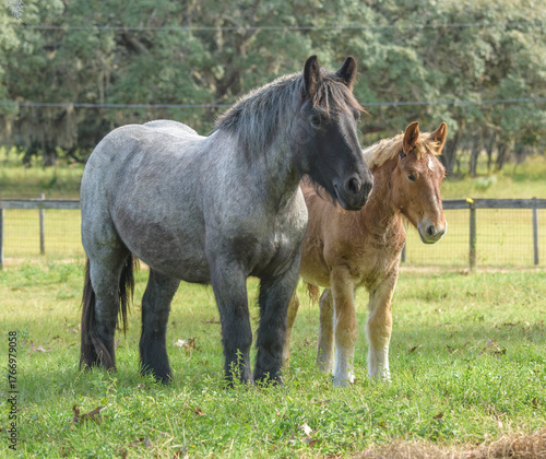 © Mark J. Barrett, Fototapeta premium Rare Ardennes draft horse filly and weanling foal sibling