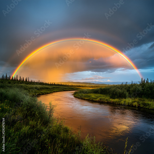 © Alan, Naklejka premium Rare Encounter: Double Rainbow Over Pristine Wilderness Creates a Magical and Awe-Inspiring Scene