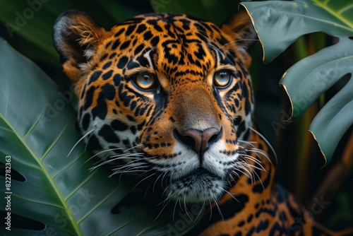 © ArtMajestic, Obraz premium Rare leopard peeks out from behind palm leaves. Portrait of majestic leopard. Concept of rare and endangered animals and biodiversity conservation