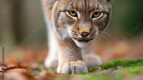 © Ruzana, Fototapeta premium Rare lynx silently walking across autumn forest floor in close-up macro view