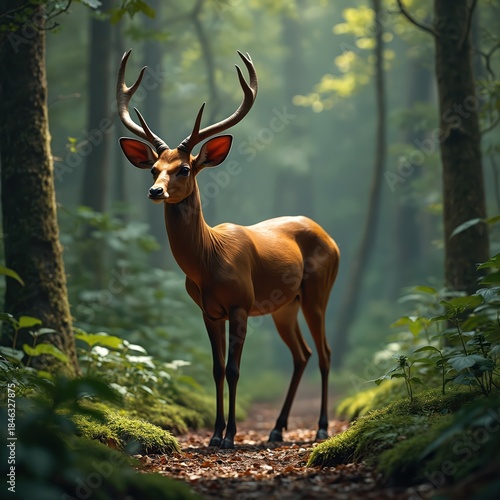 © Pete, Fototapeta premium Rare saola stands in misty forest. Forest floor covered with leaves and moss. Sunlight filters through green trees. Animal in lush green vegetation. Creature in natural habitat.