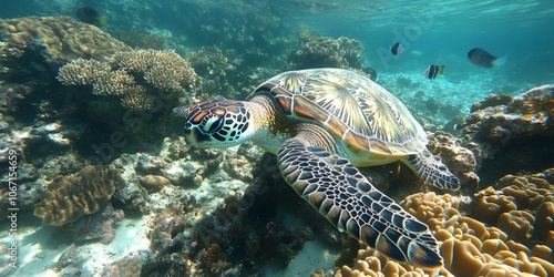 Fototapeta premium rare sea turtle navigates clear ocean with vibrant coral reefs and fish