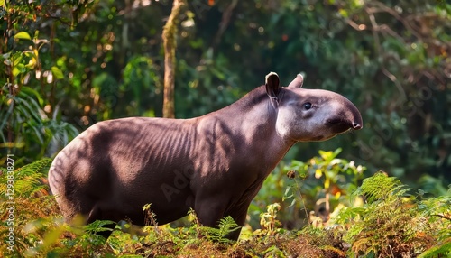 Fototapeta premium Rare Sighting of a Bairds Tapir in Tenorio Volcano National Park, Guanacaste, Costa Rica Majestic Wildlife Amidst Lush Greenery and Volcanic Landscapes at Dawn
