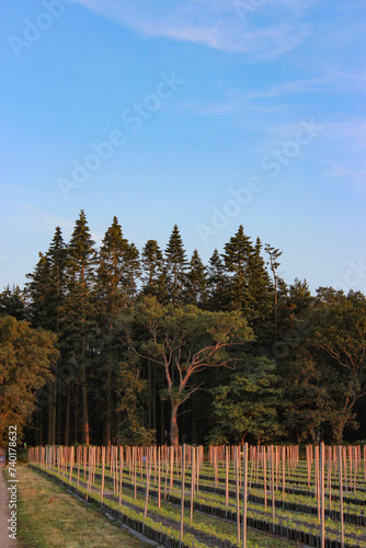 © Irina, Fototapeta premium Raspberry plants in lines with metal pipes and nets at evening sunset, British raspberry farm with green trees