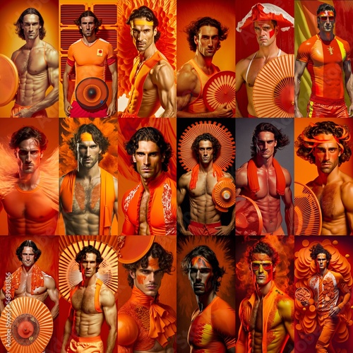 Fototapeta premium Rassige spanische Supermodels Männer in extravaganter Kleidung als Collage. AI generativ