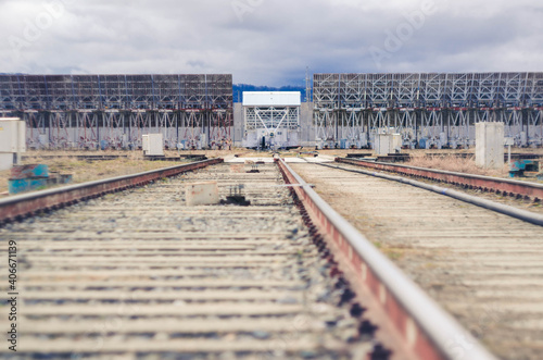 Naklejka premium RATAN-600 is the world's largest radio telescope with a reflective mirror about 600 meters in diameter. Location Karachay-Cherkess Republic. Taken with a Soviet lens Helios 44-2