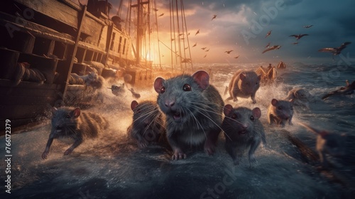 © Zie, Fototapeta premium Rats fleeing a sinking ship. It features a dramatic scene with a large ship tilting and sinking into the ocean, while numerous rats scurry away.