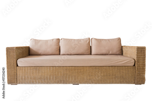 Fototapeta premium Rattan sofa with grey cushions isolated on white. Saved with cli