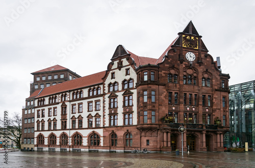 © Svitlana, Fototapeta premium Ratusz Staromiejski w Dortmundzie. Budynek znajduje się na Friedensplatz. Pochmurna, deszczowa pogoda. Żadnych ludzi w wirusie