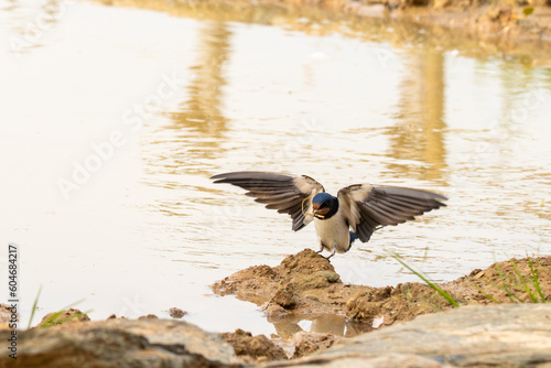 Obraz premium Rauchschwalbe (hirundo rustica) sammelt Lehm zum Nestbau