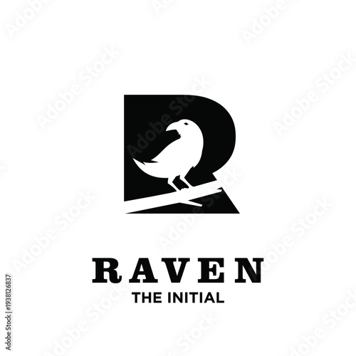 © Alpha Factory Std, Naklejka premium Raven Bird Perched on Branch Integrated into Letter R Initial Logo Design Black and White