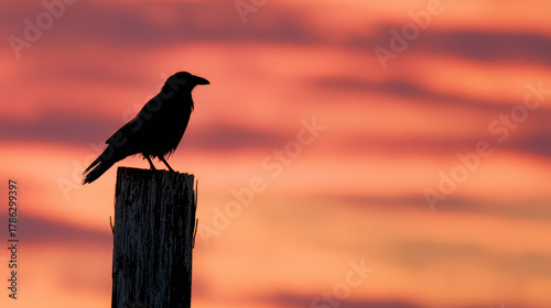 © ProVector, Fototapeta premium Raven bird silhouette perched on post at sunset