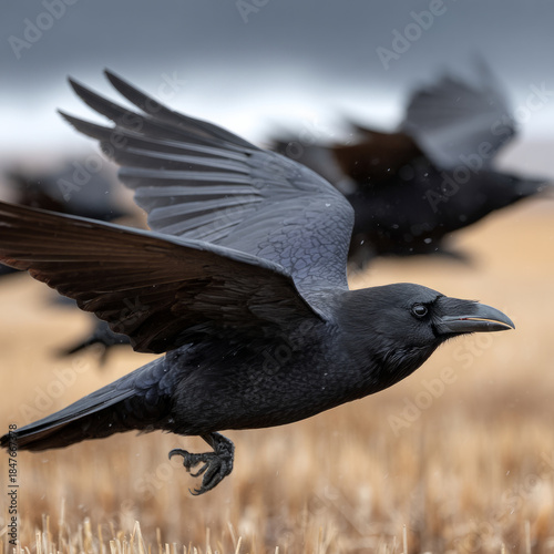 © SashaMagic, Obraz premium Raven flying over field in serene countryside landscape.