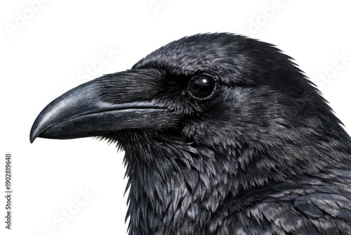 © Krtola , Fototapeta premium Raven head profile with detailed black feathers, intelligent eye, and beak on transparent background