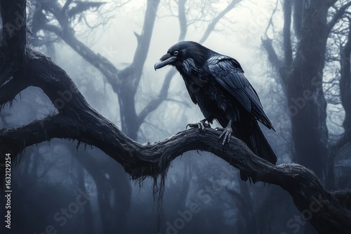 © Igor, Fototapeta premium Raven on twisted tree in gothic forest