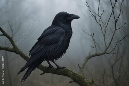 Fototapeta premium Raven Perched on a Branch in a Misty Forest, A Mysterious and Brooding Creature of the Woods