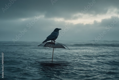 © zenith, Fototapeta premium Raven perched on a floating umbrella in the open sea under a stormy sky