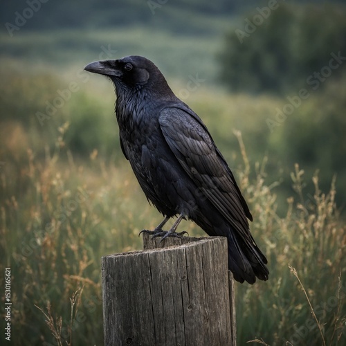 © Muhammad, Naklejka premium Raven Perched on a Weathered Fence Post