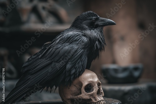 © vlntn, Obraz premium Raven Perched on Human Skull Dark Portrait