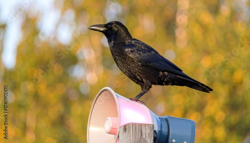 © Marwan, Fototapeta premium Raven Perched on Loudspeaker Against Autumnal Background