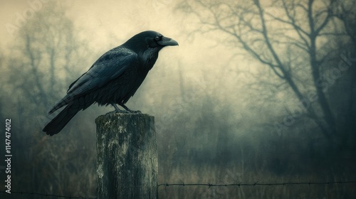 © MUMTAZ, Fototapeta premium Raven perched on post in foggy field.